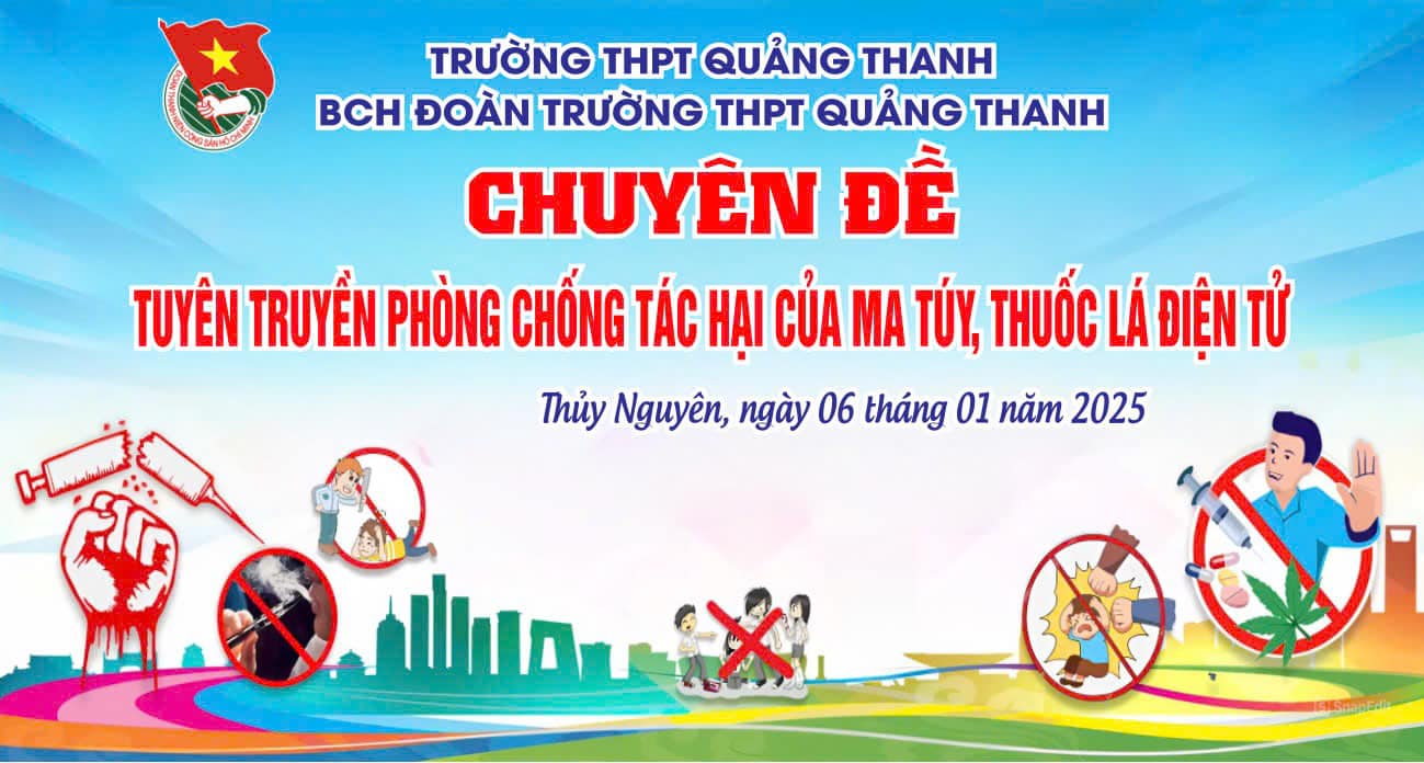Sáng ngày 06 tháng 01 năm 2025, Ban Chấp hành Đoàn trường THPT Quảng Thanh đã tổ chức chuyên đề tuyên truyền về phòng chống tác hại của ma túy và thuốc lá điện tử. Đây là hoạt động thiết thực, ý nghĩa nhằm nâng cao nhận thức của học sinh về những mối nguy hiểm từ các chất kích thích, đồng thời thúc đẩy lối sống lành mạnh trong cộng đồng học đường.